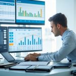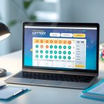 Seorang profesional menggunakan laptop di meja kerja dengan grafik dan angka yang terkait dengan lotere online, dikelilingi oleh ponsel, kopi, dan catatan.